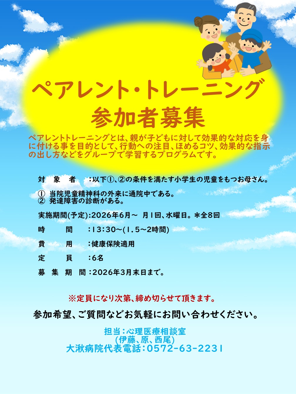 親が子どもに対して効果的な対応を身に付けることを目的として、行動への注目、褒めるコツ、効果的な指示の出し方等をグループで学習するプログラムです。